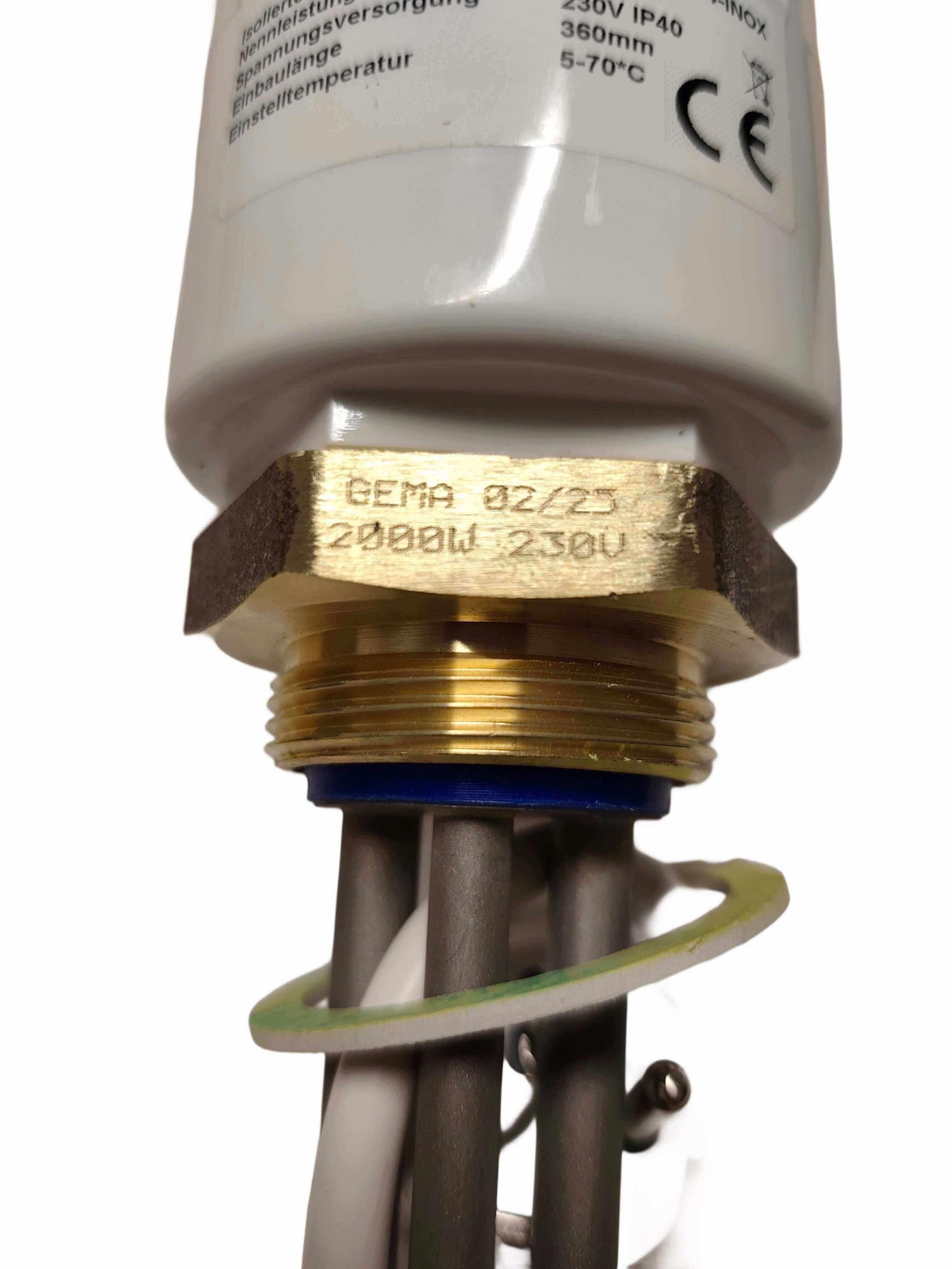 Нагревателят се предлага в различни варианти на мощност от 1500 W до 2000 W и работи на захранващо напрежение 230 V. С дължина на потапяне от 360 мм и неотопляема зона от 80 мм, той осигурява равномерно разпределение на топлината.