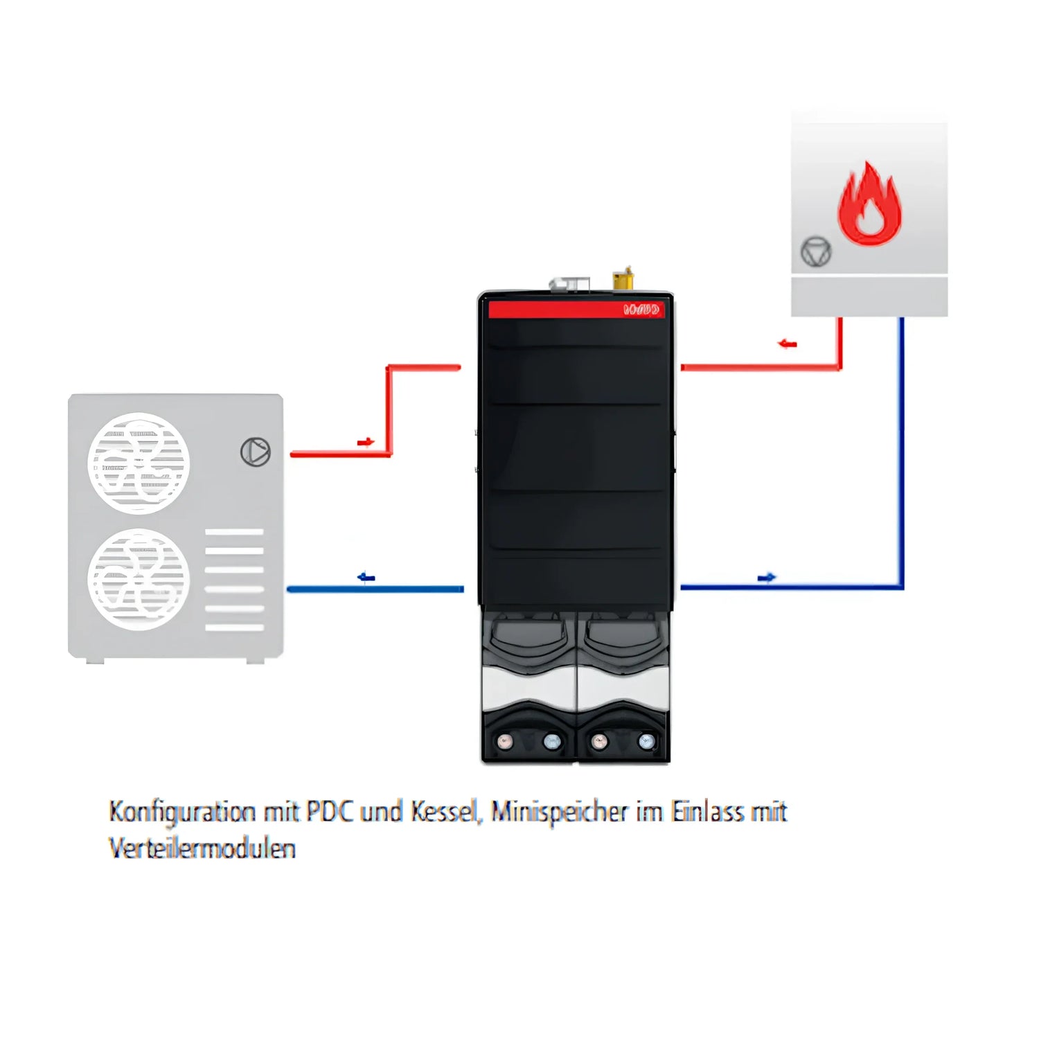 S vnějšími rozměry 520 × 860 × 240 mm (Š × V × H) a maximálním průtokem až 4,5 m³/h se zásobník vyznačuje nízkou tlakovou ztrátou a optimalizovaným hydraulickým vedením. Pro minimalizaci instalačních nákladů je z výroby integrován automatický odvzdušňovací ventil a šachta teplotního čidla.
