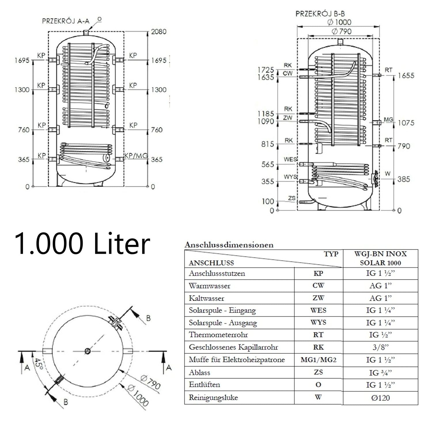 En su interior hay dos serpentines de calefacción independientes: uno de tubo de acero negro para una fuente de calor adicional (p. ej., colectores solares) y otro de tubo corrugado de acero inoxidable para un calentamiento eficiente de agua caliente sanitaria, que también permite que la unidad funcione como calentador de agua instantáneo. La presión máxima de funcionamiento del tanque de almacenamiento es de 0,3 MPa.