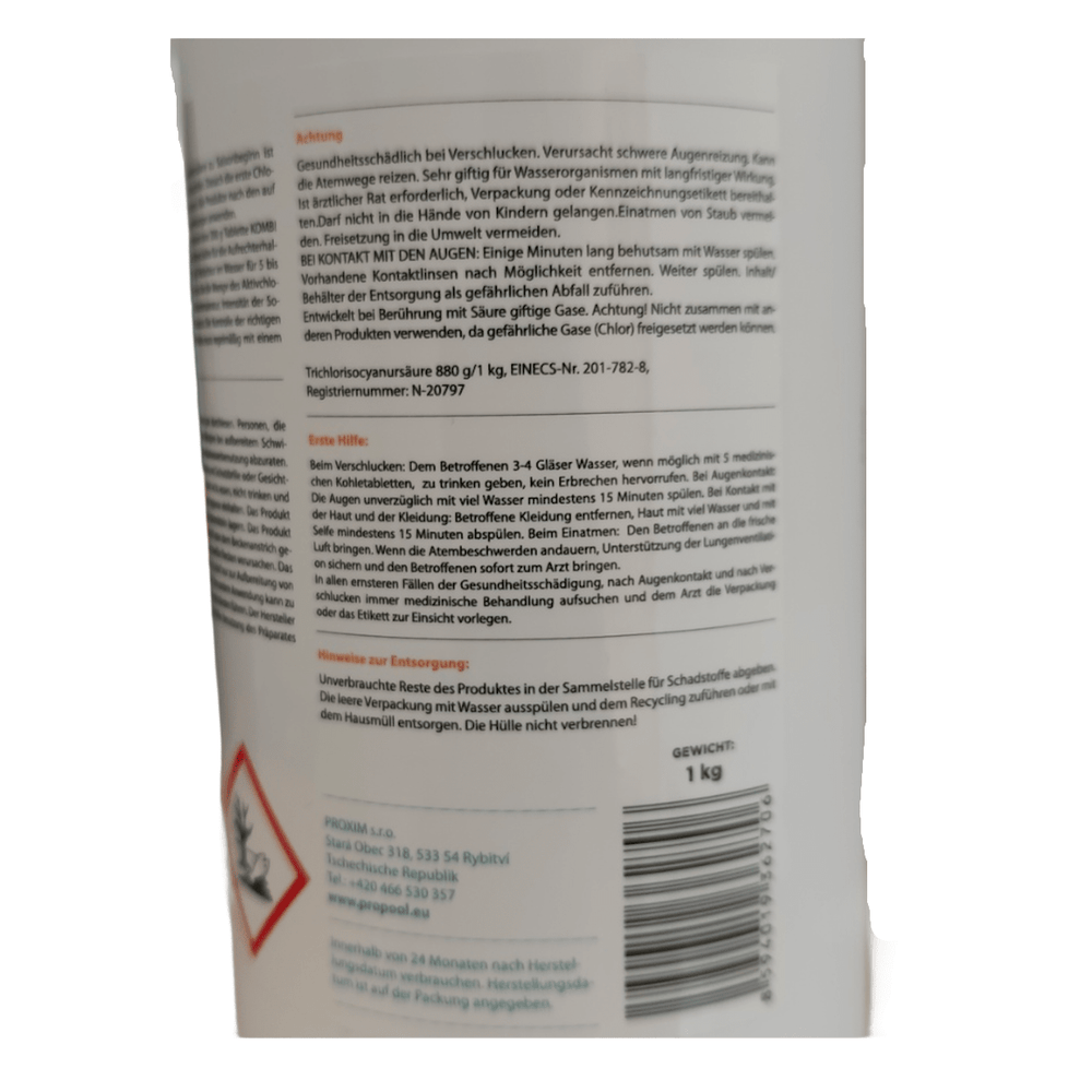 Las pastillas Combo ofrecen una solución eficaz para el tratamiento del agua de piscinas. Disponibles en dos tamaños de envase, 200 g y 1 kg, satisfacen las necesidades de piscinas pequeñas y grandes. Estas pastillas combinan varios ingredientes activos que desinfectan, floculan y abrillantan el agua, garantizando una calidad agradable y duradera.