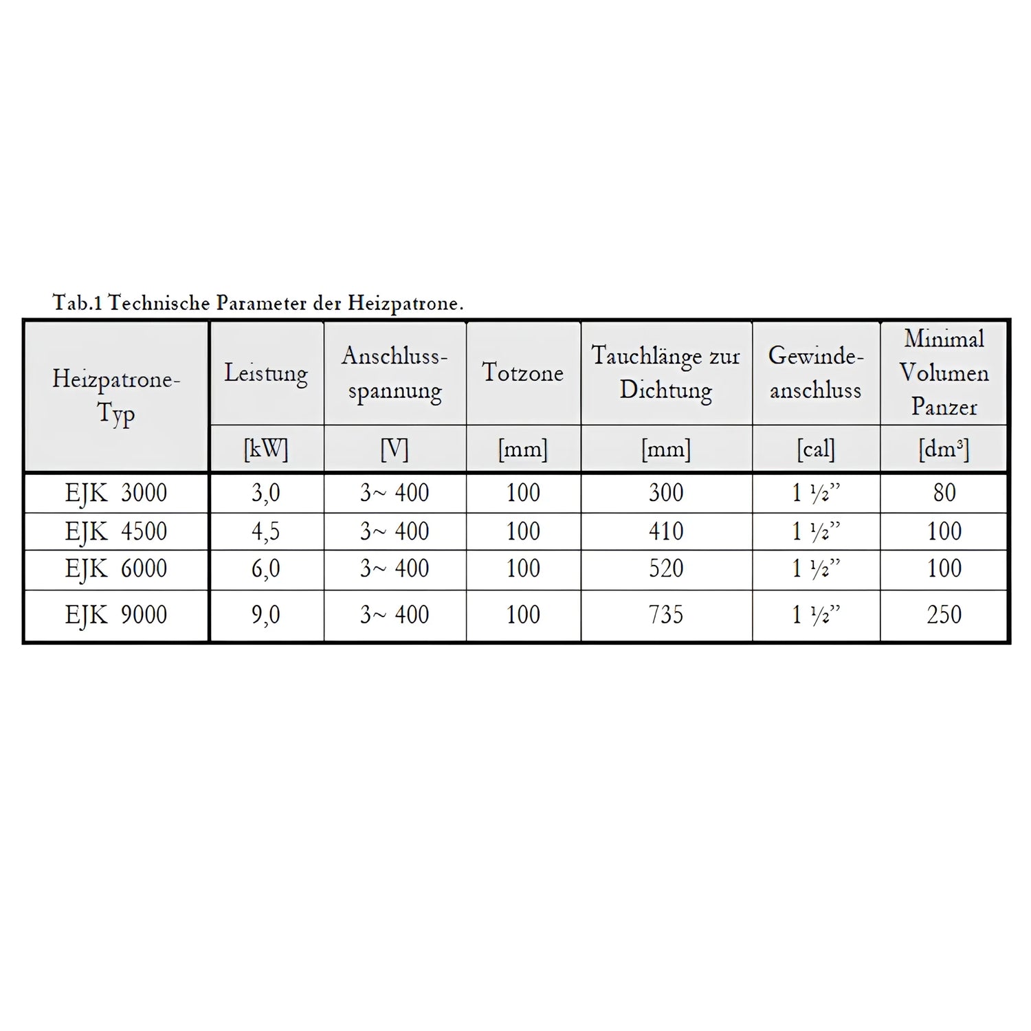 Elektriline küttekeha paigaldatakse 1 1/2-tollise keerme abil ning selle paigalduspikkus on 400 mm ja kütteta osa pikkus 70 mm. 1,5 m pikkune ühenduskaabel Schuko pistikuga võimaldab lihtsat kasutuselevõttu.