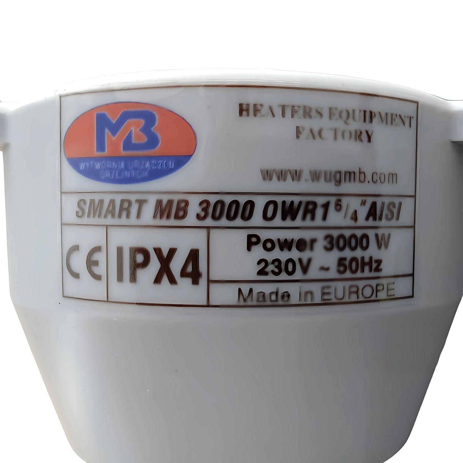 L'elemento riscaldante OWR1 SMART eroga 3,0 kW a 230 V ed è progettato per il montaggio orizzontale. Ha un diametro di 1 1/2" L'unità è dotata di filettatura di collegamento AG, nichelatura resistente e spina Schuko per una facile installazione. Un regolatore regolabile copre temperature da circa 10 °C a circa 75 °C, integrato da un limitatore di temperatura di sicurezza a 85 °C.