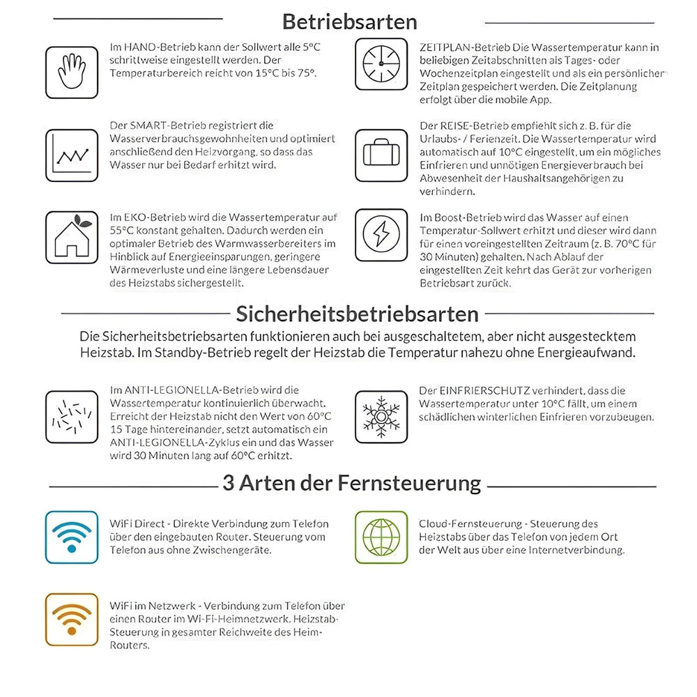 Kiti režimai, tokie kaip Eco energiją taupančiam šildymui su laiko programa pagal individualius grafikus, atostogų režimas, „Boost“ greitam šildymui, legionelių grandinė higieniniam karšto vandens ruošimui ir apsauga nuo užšalimo siūlo daugybę parinkčių. Naudojimas.