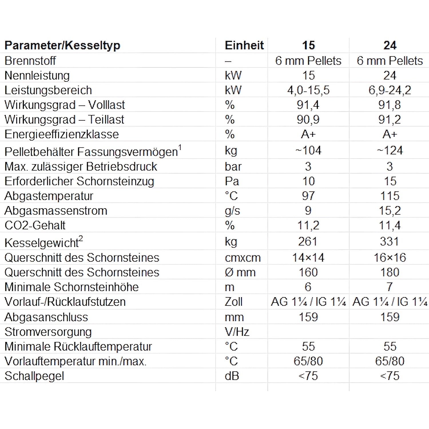 Dostępne moce nominalne obejmują 15 kW i 24 kW; Ogólnie rzecz biorąc, seria obejmuje szeroki zakres mocy od ok. 11 do 30 kW. Urządzenie spełnia 5 klasę emisyjną oraz wymagania normy Ecodesign i jest klasyfikowane w klasie efektywności energetycznej A+.