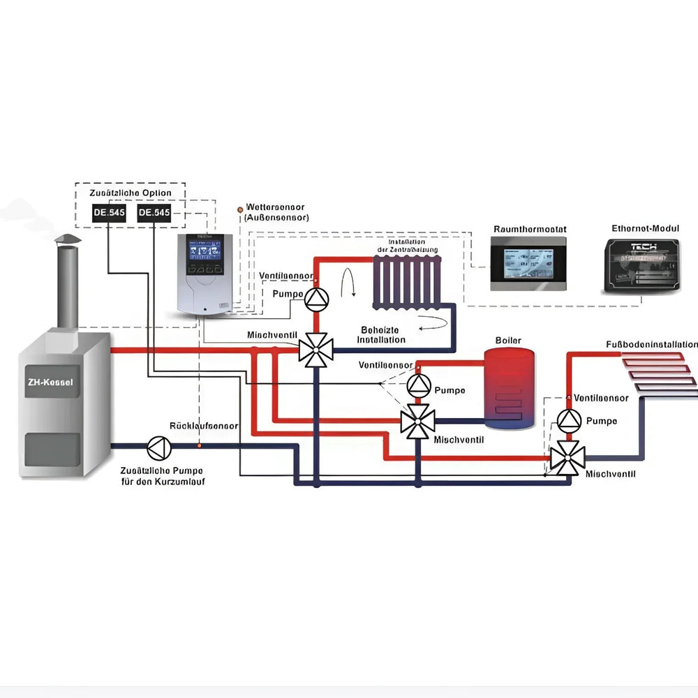 Ten TECH i-1 CWU Ten wszechstronny regulator ogrzewania został zaprojektowany do precyzyjnego sterowania zaworami mieszającymi trój- lub czterodrogowymi. Idealnie nadaje się do systemów grzewczych z grzejnikami, ogrzewaniem podłogowym lub zaworami zwrotnymi, oferując kompleksowe funkcje sterowania i ochrony dla wydajnej i bezpiecznej pracy.