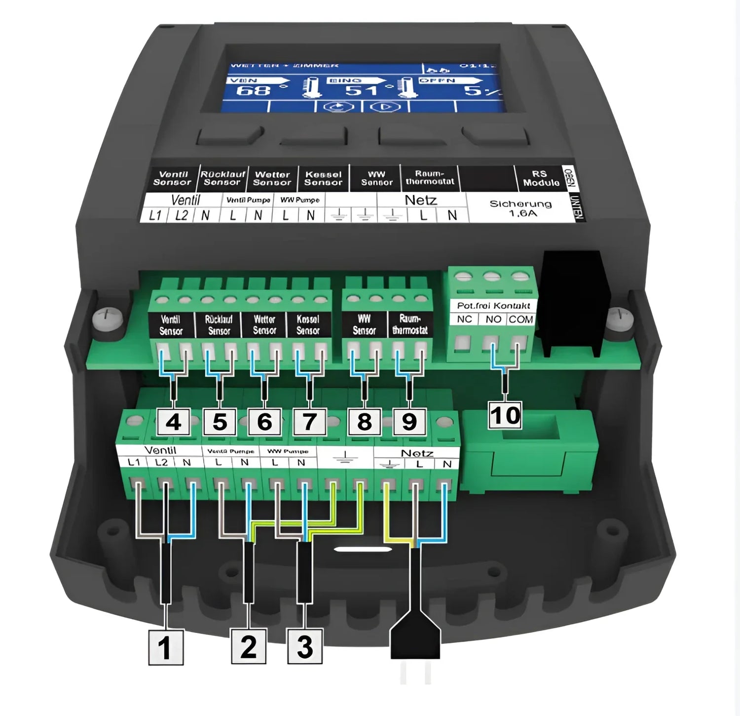 Este controlador de circuito de aquecimento garante um controle constante da temperatura de fluxo, dependendo das condições climáticas, usando o sensor de temperatura externa incluído. Ele também controla o motor do misturador para garantir um aumento no fluxo de retorno ao usar um misturador de quatro vias. Isso torna o aquecimento mais eficiente e você se beneficia do uso ideal de energia.