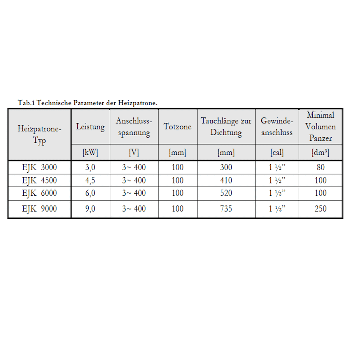 Cartușul de încălzire al pachetului complet este disponibil în diferite clase de putere, special concepute pentru 1,5 kW, 2,0 kW, 3,0 kW la 230 V și 4,5 kW, 6,0 kW și 9,0 kW la 400 V. Aceste variante permit o adaptare optimă la cerințele energetice individuale ale sistemului de încălzire.